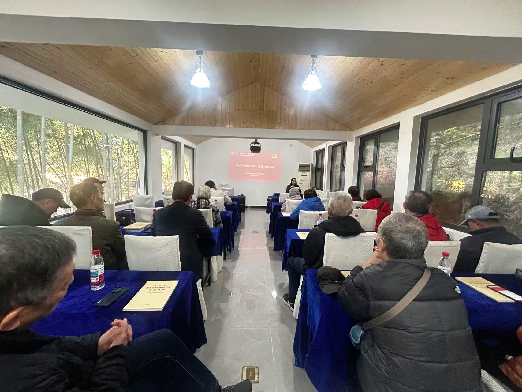 上午,学校离退休党总支在杭州井山坞生态文化园会议室组织开展了集中专题学习。离退休党总支书记谢徐娟作“党的二十届四中全会精神解读”专题报告,组织老同志集中观看《习近平谈治国理政》第五卷在线视频。与会同志围绕全会精神的核心要义与《习近平谈治国理政》第五卷的思想精髓展开深入交流与讨论,现场学习氛围庄重、热烈。